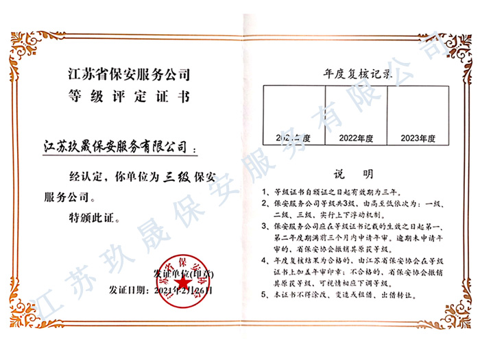 Prev:江蘇省保安服務(wù)公司等級評定證書(三級保安服務(wù)公司)
