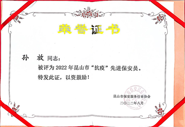 Here, congratulations to our company Ren Wenxue and Sun Fang for winning the title of "2022 Kunshan City Anti-epidemic Advanced Security Guard".