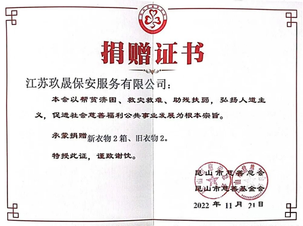Adhering to the corporate spirit of "humanity, fraternity and dedication" and the corporate culture of philanthropy, Jiusheng, Kunshan Security Company, donated four boxes of clothes to Kunshan Charity Federation on the afternoon of November 21, 2022, and was subsequently allocated by Kunshan Charity Federation to the people in need.