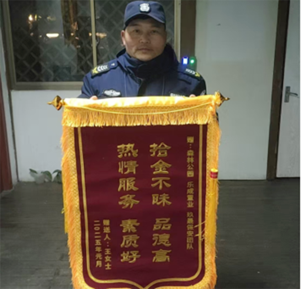 Coincidentally, in the same month at the forest park, security guard Yao Zhikuan also won praise from tourists for his noble character. The owner was extremely grateful for Yao Zhikuan's act of returning the lost property, and specially customized a banner to send to the Forest Park Management Office to express their deep gratitude!