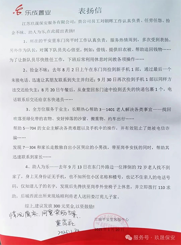 These thoughtful services are visible to the owners. The client unit was deeply moved and sent a letter of commendation to Jiangsu Jiusheng Company, highly praising the security team's quality of returning lost property and helping others, as well as their serious and responsible attitude, affirming that they have created a safe and harmonious living environment for the project.