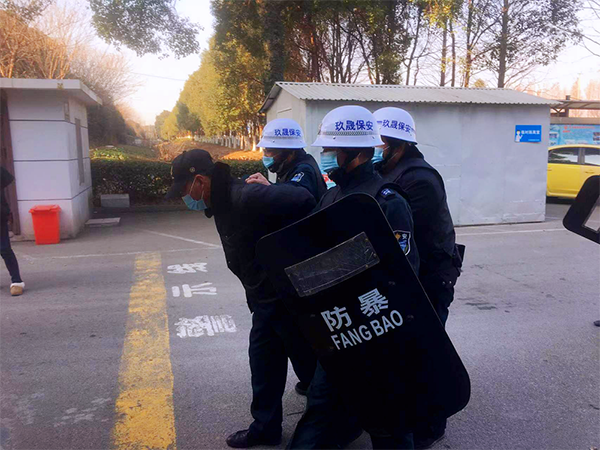 物業經理接到報告后,立即宣布啟動(防暴反恐應急預案)開啟警報,保安隊員聽到警報后,迅速攜帶防爆器材趕到校門口,按應急預案要求進入各自戒備狀態,此時該男子情緒更加激動,突然掏出匕首想沖向校園大門,執勤保安迅速對嫌疑人進行合圍,利用警用鋼叉、防爆盾牌、警棍、辣椒水等反恐防爆器材將嫌疑人控制并擒獲,及時移交給趕到的警方依法處理。