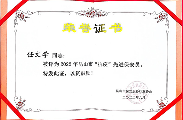 在此,也恭喜我司任文學(xué)及孫放同志榮獲“2022年昆山市抗疫先進(jìn)保安員”稱(chēng)號(hào)。