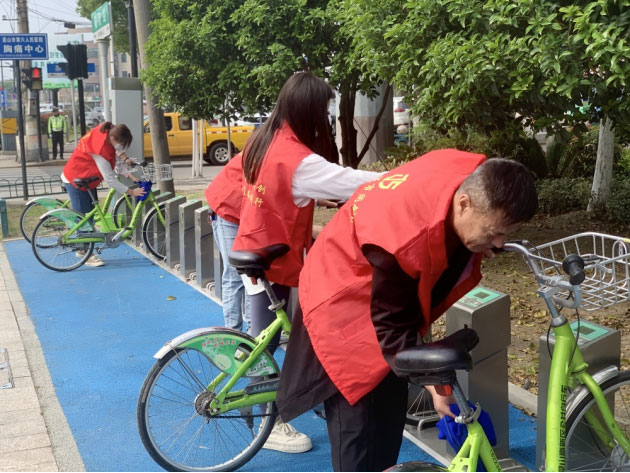 我們首先把共享單車擺放整齊,然后用抹布把單車擦拭干凈,完成之后我們繼續(xù)沿路行進(jìn),每經(jīng)過(guò)一個(gè)單車停車點(diǎn),我們都會(huì)把共享單車整齊規(guī)整的擺放在車位上,每輛單車都被擦拭的干干凈凈,整齊劃一擺放好,讓共享單車更美觀、使用時(shí)更便捷。